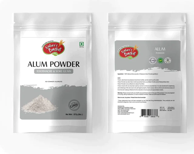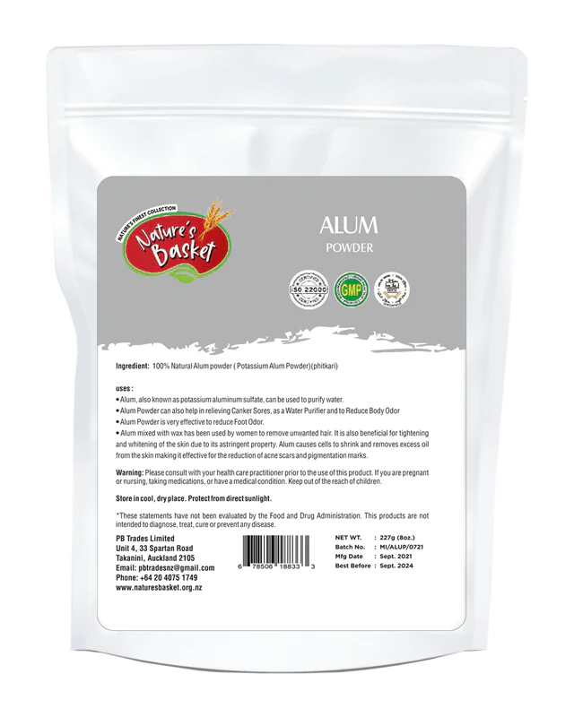 Nature's Basket Alum Powder is a 100% pure and natural product that is sourced from high-quality ingredients. It is commonly used for its astringent and antiseptic properties and is ideal for various uses. Our alum powder is free from harmful chemicals and is suitable for external use only.
