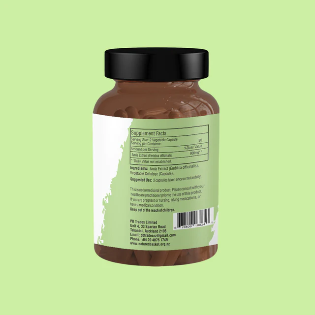 Nature's Basket Amla Extract Capsules contain 900mg of pure organic Amla fruit extract. Amla, also known as Indian Gooseberry, is a rich source of antioxidants, vitamin C, and other beneficial nutrients that can help boost your immunity and promote healthy digestion.