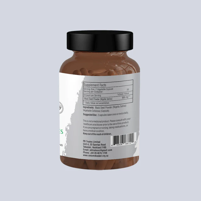 Take 1-2 Nature's Basket Black Seed Capsules 900mg daily with water or as directed by your healthcare professional.