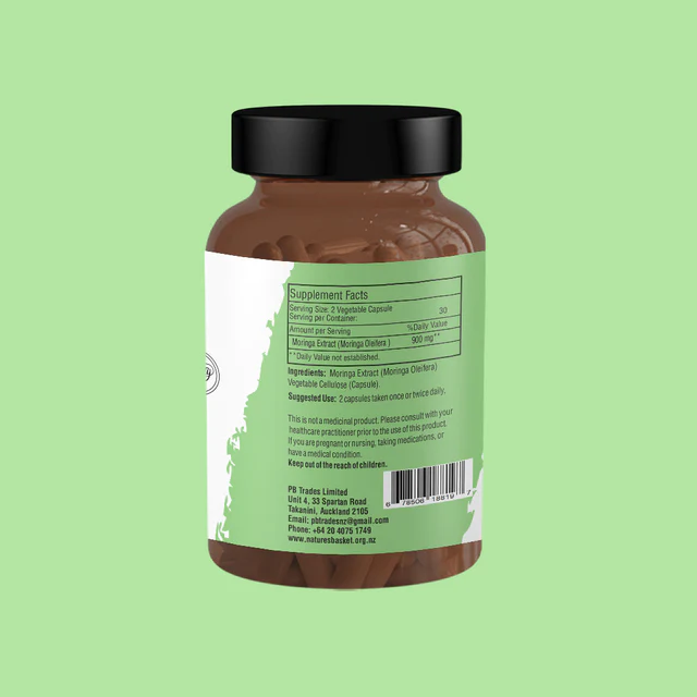 Nature's Basket Moringa Extract Capsules are a natural and organic superfood supplement made from the nutrient-dense leaves of the Moringa Oleifera plant. Each capsule is carefully crafted to provide you with the optimal dose of Moringa's health benefits, including improved energy, immunity, and digestion. With its anti-inflammatory and antioxidant properties, this supplement is a great addition to any healthy lifestyle.