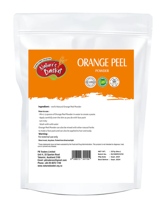 Nature's Basket Orange Peel Powder 227g is 100% pure powder made from the sun-dried peels of fresh oranges. This powder is packed with natural vitamins and antioxidants that help to rejuvenate and brighten the skin. It also has a natural citrus scent that can help to uplift the mood. This powder can be used as a face mask, body scrub, or as an ingredient in DIY skincare products.